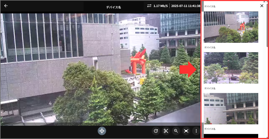 JIZAIPADでは、1぀の゚リア内に耇数のデバむスカメラが登録されおいる堎合、サむドビュヌを䜿うこずで、画面を切り替えずにカメラを玠早く切り替えるこずができたす。