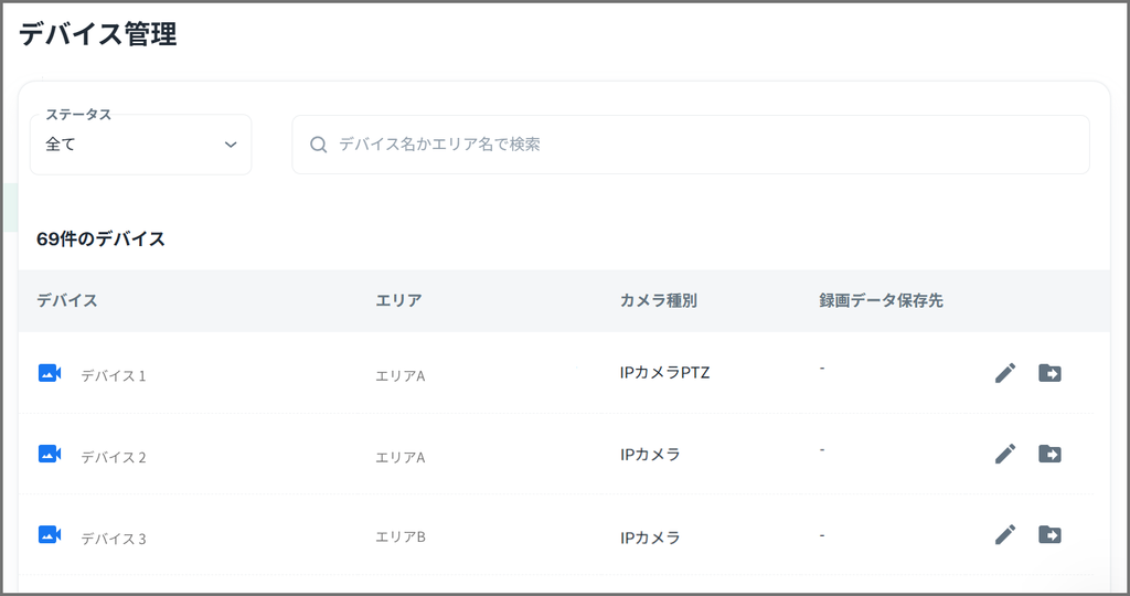 ãã®ç»é¢ã§ã¯ãçŸåšç»é²ãããŠããå šãŠã®ã«ã¡ã©ïŒããã€ã¹ïŒãäžèЧã§ç®¡çã§ããŸãã
