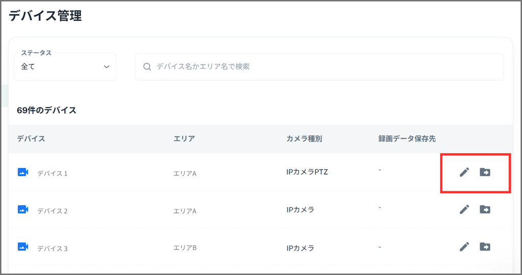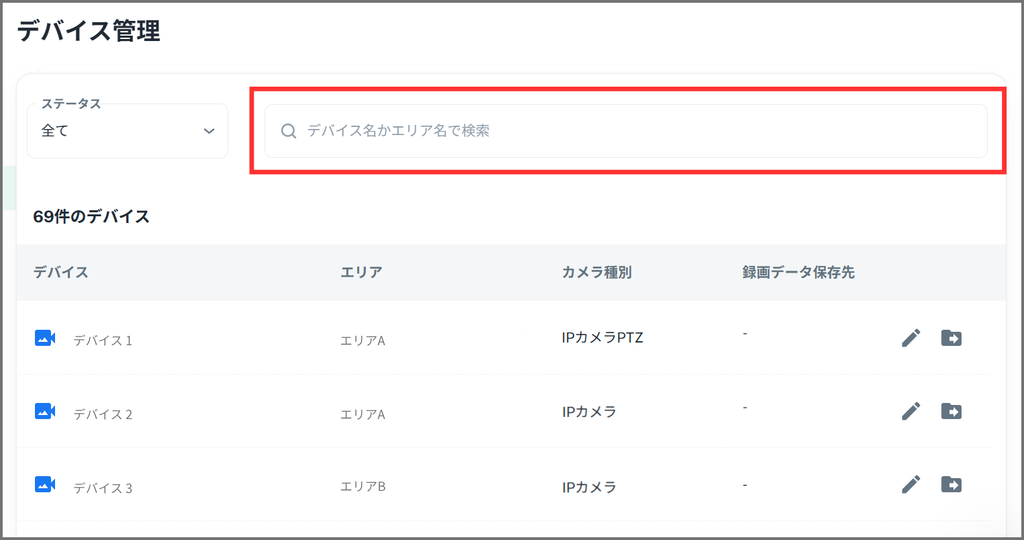 ããã€ã¹ç®¡çç»é¢äžéšã®æ€çŽ¢ããŒã§ãããã€ã¹åãŸãã¯ãšãªã¢åãå ¥åãããšã該åœããããã€ã¹ãæ€çŽ¢ã§ããŸãã