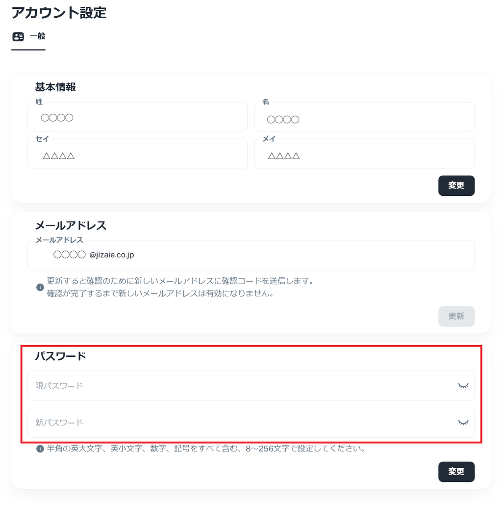 ・「現在のパスワード」と「新しいパスワード」を入力し、変更を完了してください