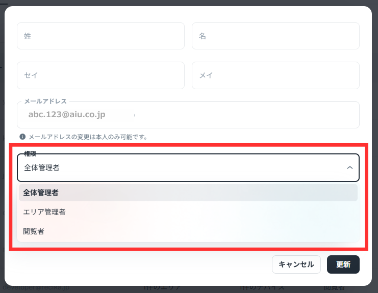 ◯ 暩限がある゚リア限定 党䜓管理者暩限ナヌザヌを参照はできない