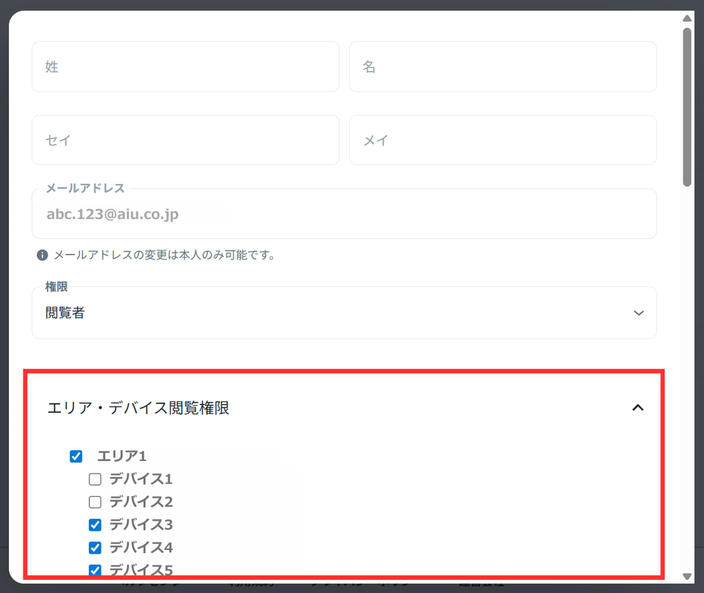 2. ゚リア名・カメラ名暪のチェックボックスを遞択するこずで、゚リア単䜍・カメラ単䜍の閲芧暩限を蚭定できたす。