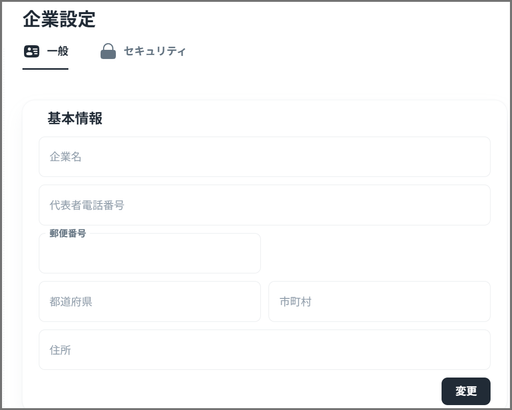 äŒæ¥èšå®ç»é¢ã§ã¯ãäŒç€Ÿã®åºæ¬æ å ±ãã»ãã¥ãªãã£èšå®ã管çããããšãã§ããŸããç»é¢äžéšã«ããã¿ãã§ãäžè¬ããšãã»ãã¥ãªãã£ããåãæ¿ããŠãåèšå®ãè¡ããŸãã