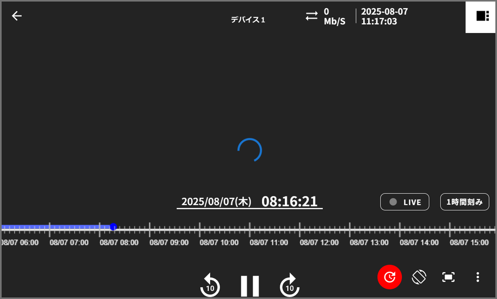 画像のように画面中央にローディングアイコンの表示が続き、録画映像が再生されない場合、以下の手順に沿って原因を切り分け、対応を行ってください。