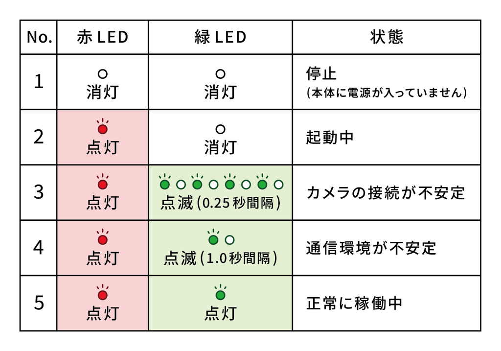 No.3の状態(赤:点灯、緑:点滅 0.25秒)であれば、カメラの接続に問題がある可能性があります。