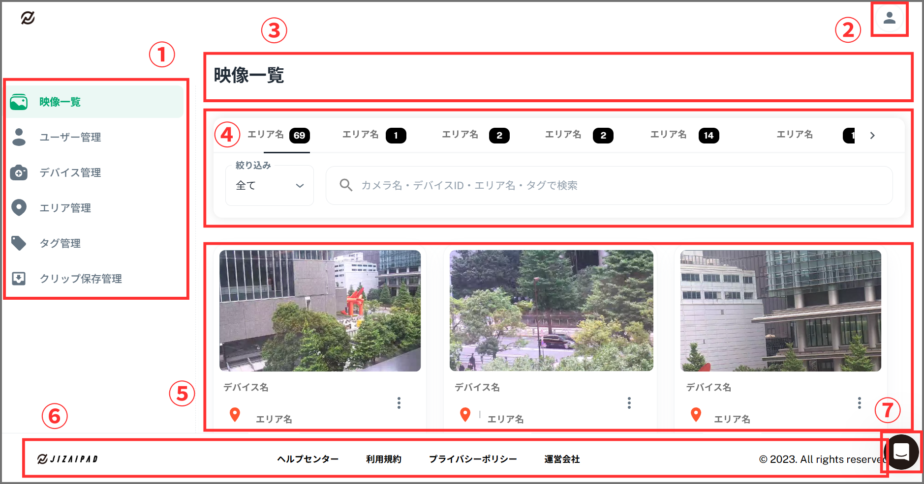 検索バーでデバイスの絞り込みと検索(カメラ名・デバイスID・エリア名・タグ)ができます