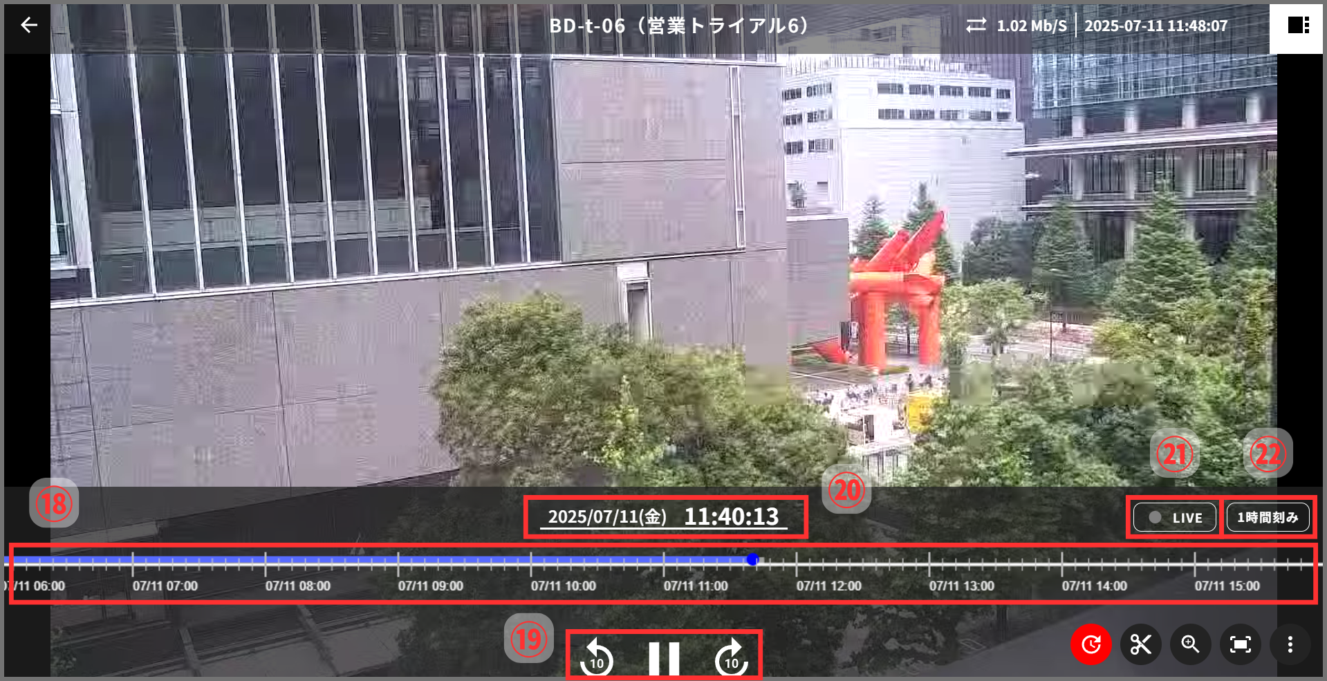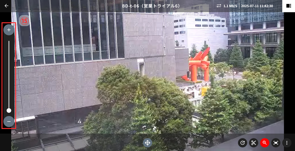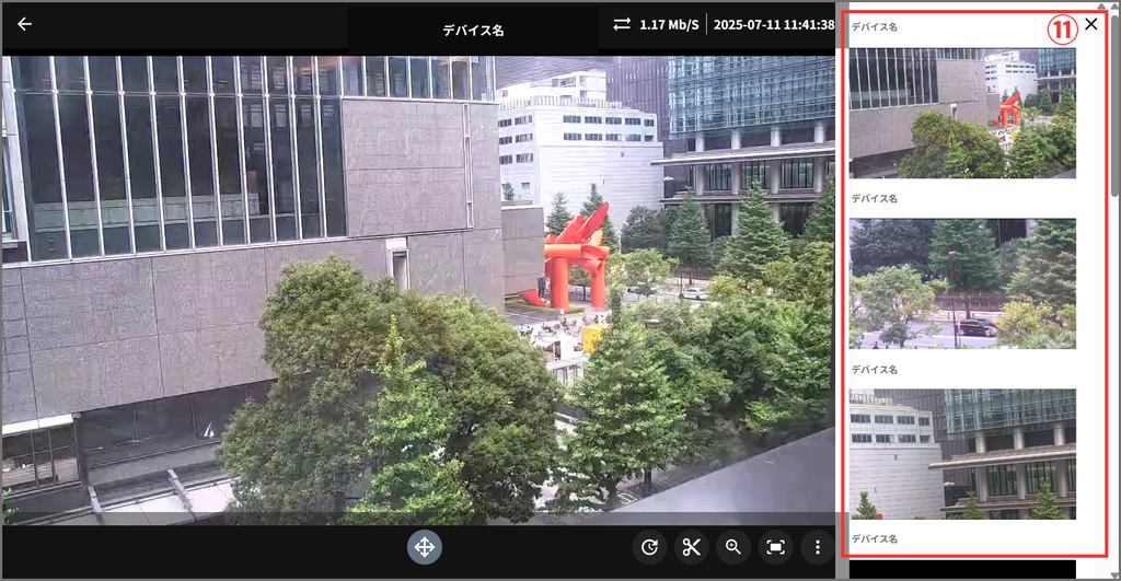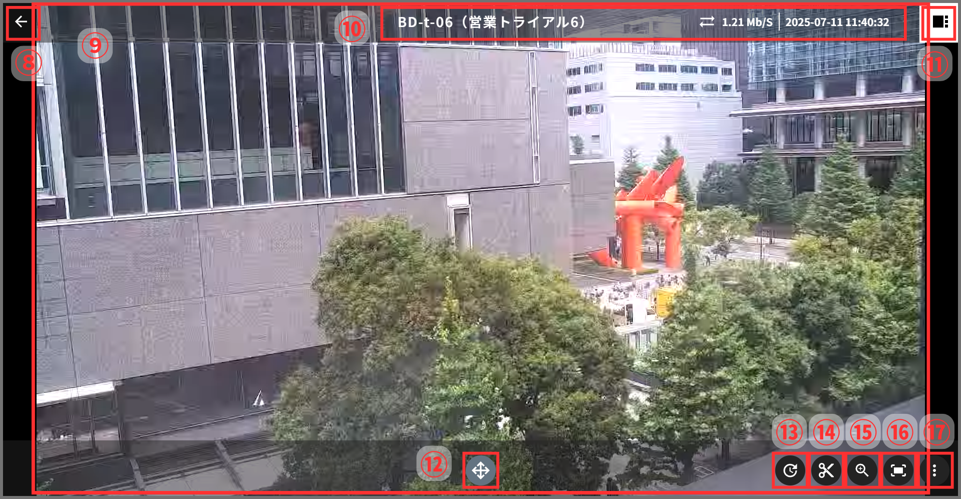 プレイヤー画面では、「カメラ名称」「通信速度(上り)」「現在時刻」が表示されます